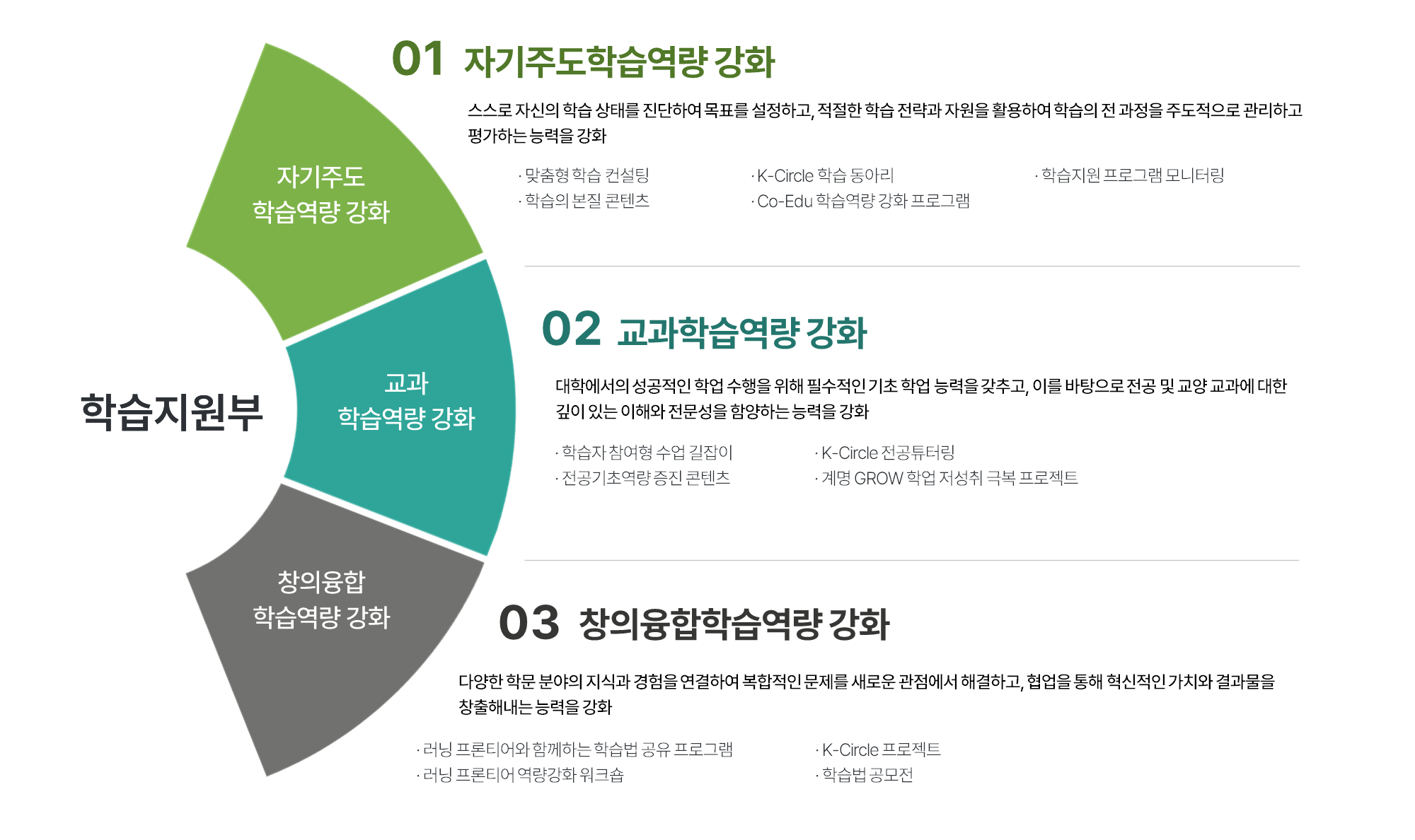 학습지원부는 계명 인재상인 FACE 역량을 갖춘 창의적 미래 인재의 양성을 목표로 합니다. 이를 위해 자기주도, 교과, 창의융합 영역의 전문화된 학습역량 강화 프로그램을 운영하여 학생들의 주도적인 학습 성장을 지원합니다. 학습지원 프로그램 체계